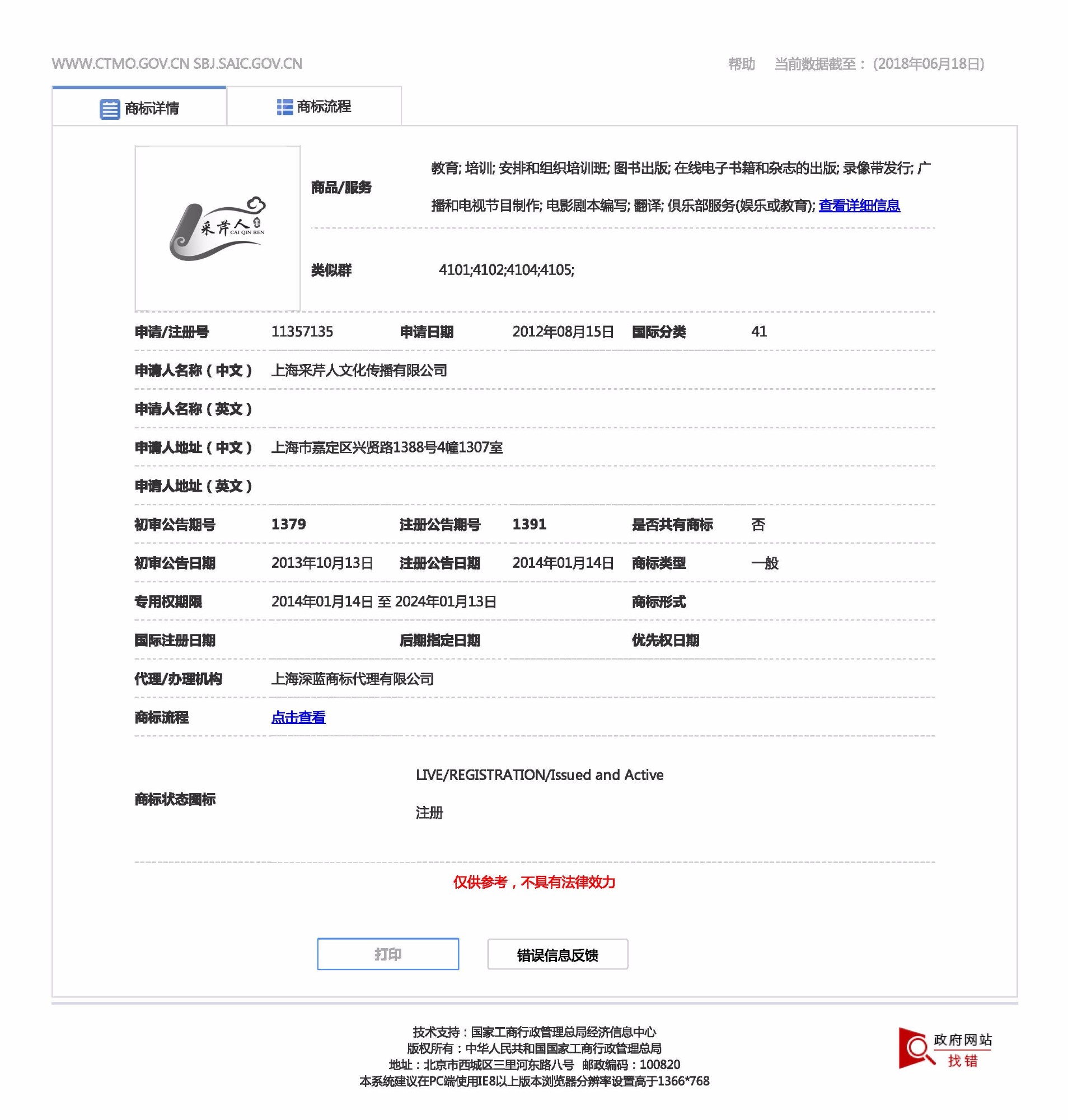 商標(biāo)注冊(cè)證核定使用商品:教育; 培訓(xùn); 安排和組織培訓(xùn)班; 圖書出版; 在線電子書籍和雜志的出版; 錄像帶發(fā)行; 廣播和電視節(jié)目制作; 電影劇本編寫; 翻譯; 俱樂部服務(wù)(娛樂或教育)。