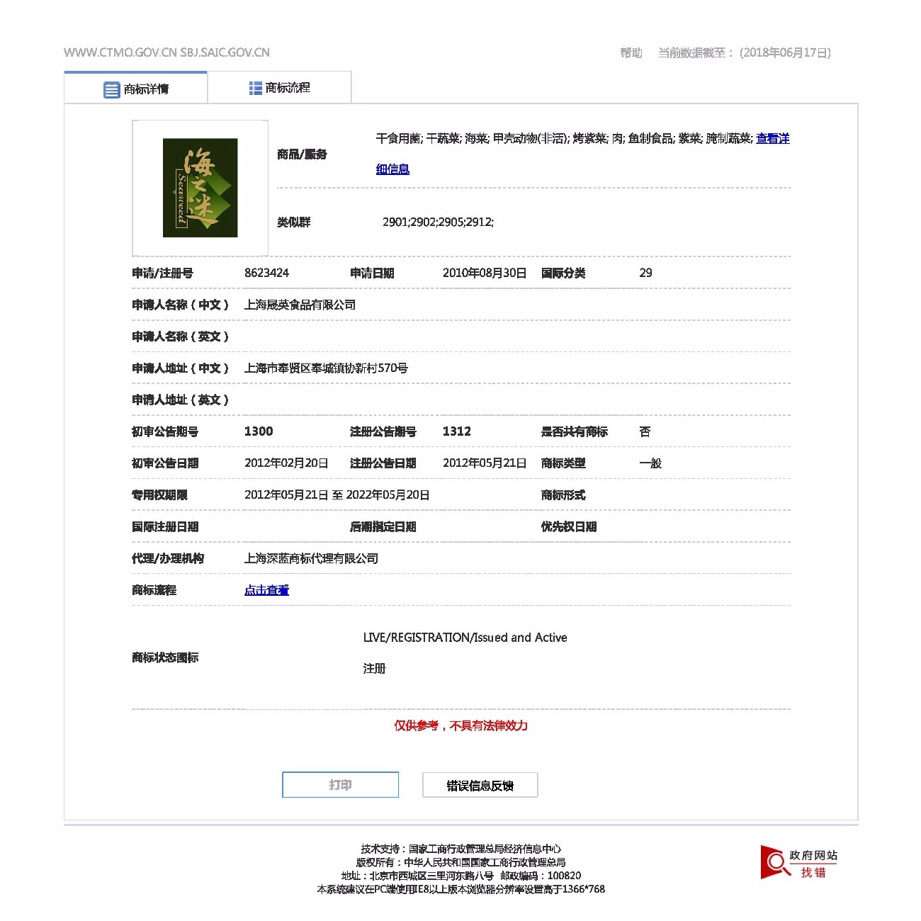 商標注冊證核定使用商品:干食用菌; 干蔬菜; 海菜; 甲殼動物(非活); 烤紫菜; 肉; 魚制食品; 紫菜; 腌制蔬菜。